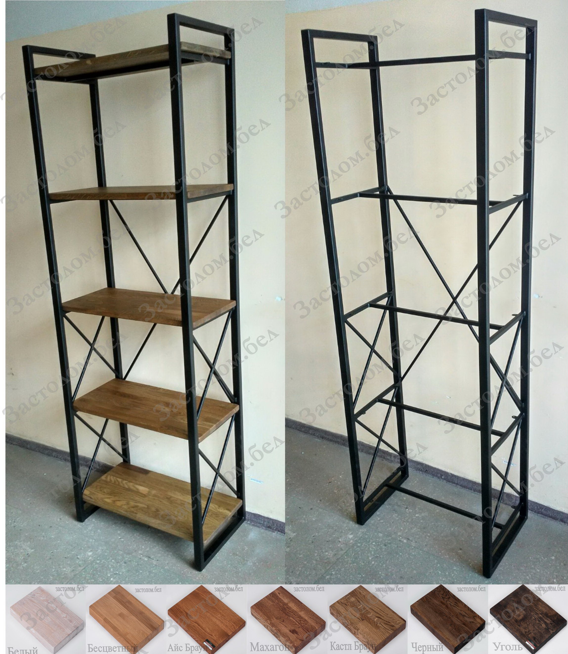 Стеллаж на металлокаркасе с полками из ЛДСП или массива дуба серии "Н-2". Выбор размера и цвета