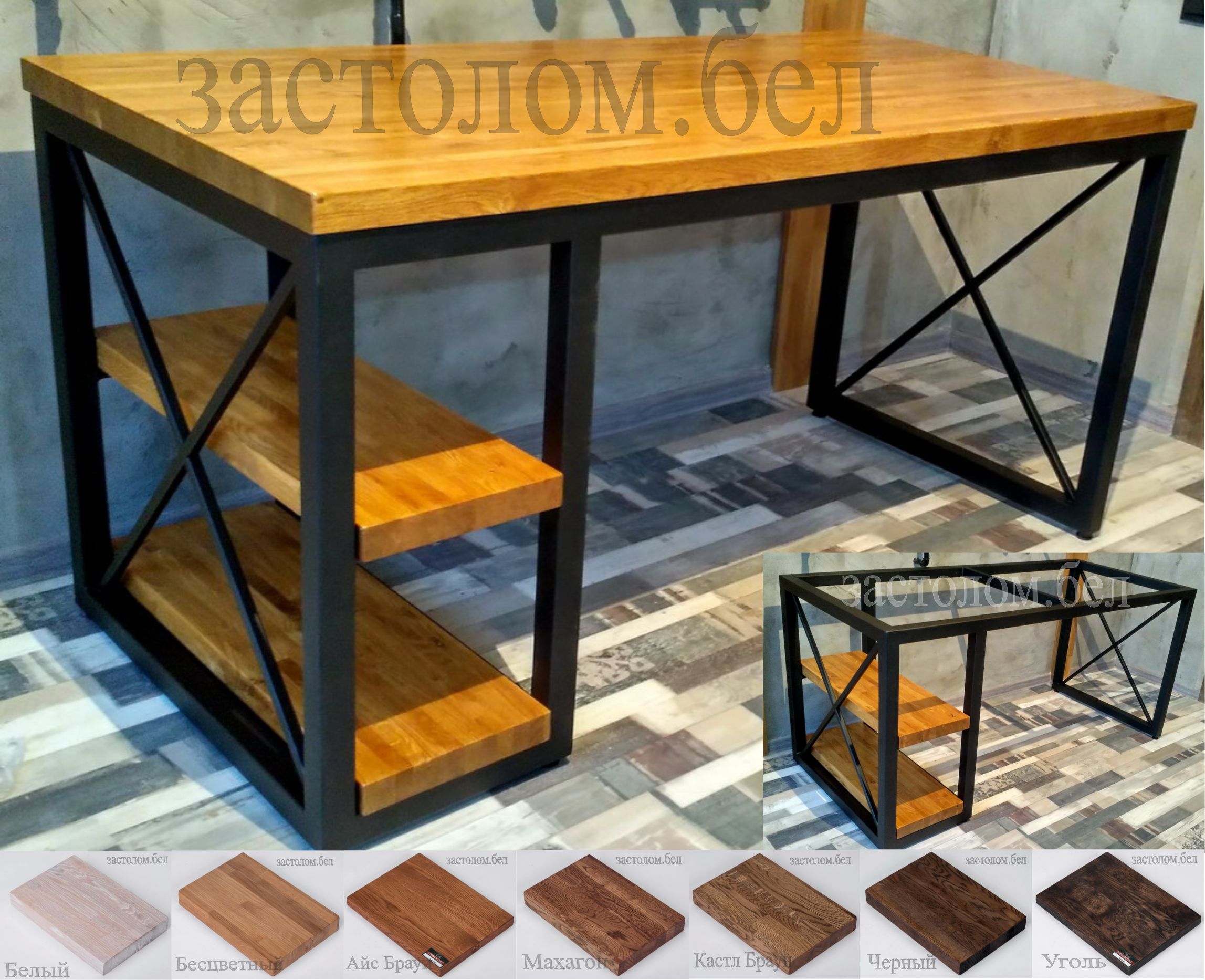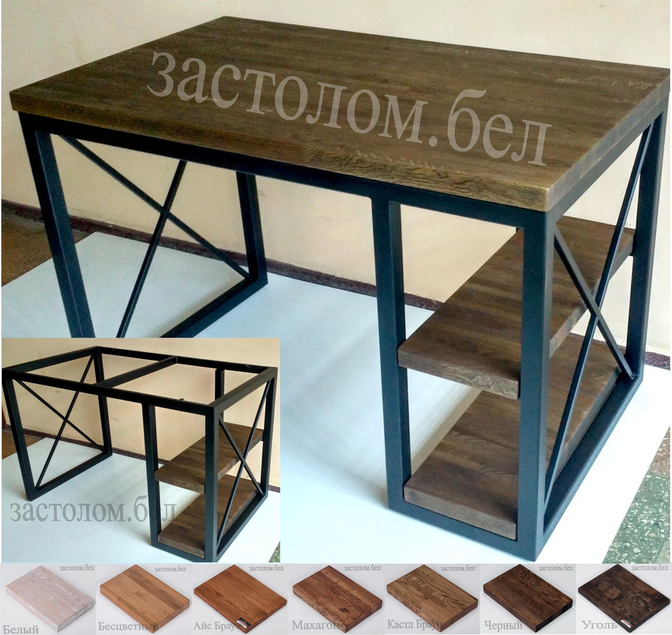 Индивидуально разработаем, изготовим, доставим и соберем ПОД КЛЮЧ рабочие столы с полками серии "О-Х" любого размера и формы на металлоконструкциях со столешницами из массива дуба, постформинга или ЛДСП с выбором цвета. Доставка по всей РБ